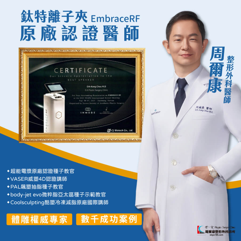 周爾康醫師受到原廠認證為鈦特離子夾EmbraceRF「原廠認證醫師」,並受邀於學會活動分享臨床應用與治療經驗,事實上周爾康醫師在體雕手術經驗十分豐富,不僅是通過威塑體雕創始人 Dr. Alfredo Hoyos 系統化訓練之官方證明,更是VASER威塑 、PAL 飆塑抽脂、body-jet微粹脂 、Renuvion超能電漿等多項原廠講師與教官,若想一次處理鬆弛與曲線,長年專研體雕技術的周爾康醫師您會是最佳選擇!