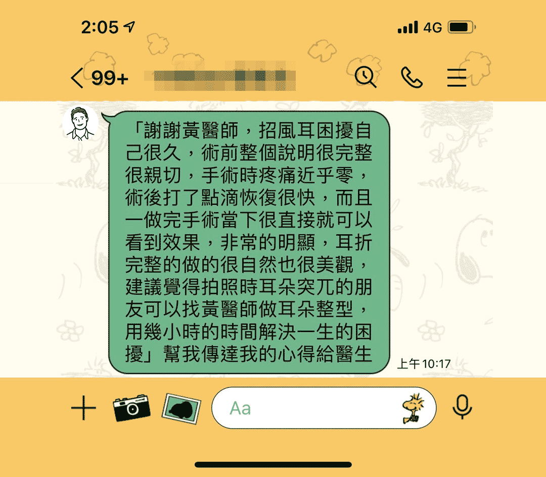 由於先天招風耳的耳型問題,導致他平常在拍照時耳朵都非常突兀、明顯,長期受到招風耳困擾的他來到周爾康整形外科診所諮詢,經過黃馨慧醫師仔細的講解評估與高超的執刀技術後,術後耳朵非常自然、角度也讓他十分滿意,黃馨慧醫師用幾個小時的時間就解決他一生的困擾,也讓他特別來訊感謝黃馨慧醫師。