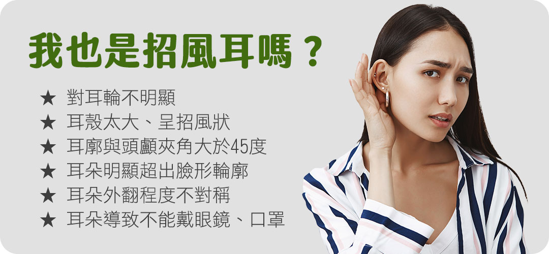 招風耳是指耳朵與頭部側面之間的夾角大於30°以上,容易顯得耳朵特別明顯,基本上每20人就有1人有先天的招風耳情形,許多有招風耳的人在學童時期都曾經因為耳朵較為高聳、突出,而成為同擠嘲弄、開玩笑的對象,被說像「猴子」、「米老鼠」、「小飛象」、「外星人」甚至電影魔戒中的「咕魯」,許多人都認為招風耳會讓個人外表產生稚氣、滑稽的感覺,不過也有人認為招風耳可以顯得臉更小、更有可愛的氛圍,另外在傳統面相學上普遍也都認為招風耳是「破財之相」又或是認為這類人性格較容易衝動,因此也造成許多有招風耳的人較為自卑、不喜歡自己的耳朵樣貌,也希望可以改變招風耳的情形。